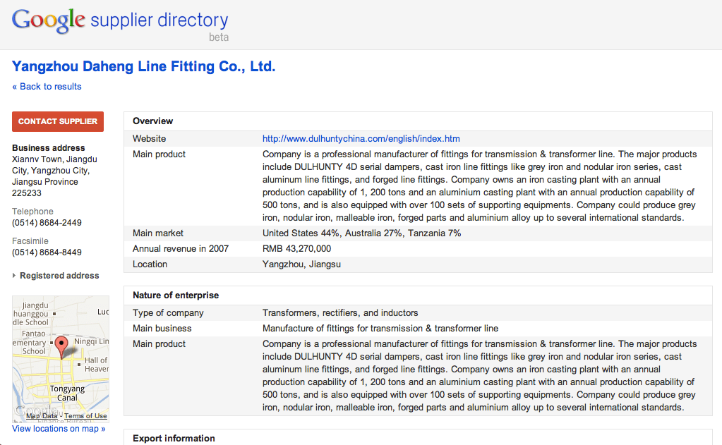 On an individual company’s page, there is more detail provided, including the company contact information and location on a map. There’s also a red “Contact Supplier” button which allows users to reach out directly to the supplier through Google.