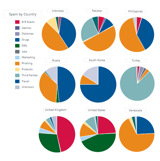 Social engineering is also a lure used in targeted attacks that depend greatly on geography and language. Attackers show insight into what works in different cultures and regions – not just globally but also seasonally, and can vary by month, season or holiday. In the United States, “Delivery Service Notifications” (or fake error messages) are the most popular, while in the United Kingdom “419 scams” reign supreme. In France, phishing scams dominate, while drug spam is the most popular lure in Russia.