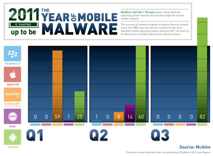 Intel-owned McAfee has released its third quarter security report, which shows that malware targeted towards phones running on the Android operating system continues to be on the rise. According to the report, Android OS solidified its lead as the primary target for new mobile malware. The amount of malware targeted at Android devices jumped nearly 37 percent since last quarter, and puts 2011 on track to be the busiest in mobile and general malware history. Nearly all new mobile malware in Q3 was targeted at Android. This follows a 76 percent rise in Android malware in Q2 of 2011.