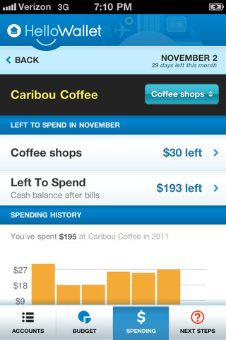 What’s really neat is to see the bar graph of historical spending for a venue in HelloWallet, something that may give impulse shoppers pause before another big purchase. Think of the advantage for gadget-aholics (ahem) who spend far too much at Best Buy or the Apple Store, for instance. The graph is that much-needed visual reminder to slow down.