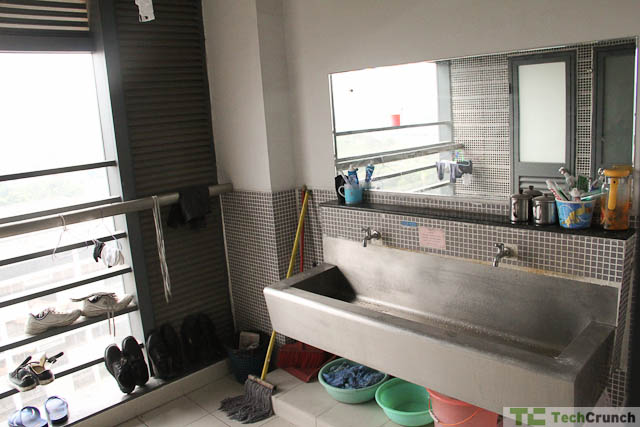 The dorms had rooms for four men or women each, with a small, closed balcony for smoking. Shoes were piled up in the bars of the balcony and one nice selection of books – management, calculus, university-level english and economics – lining their small shelves. It was a college dorm room minus the fun. There were no Mountain Dew can pyramids, just the bare necessities and a few comforts.