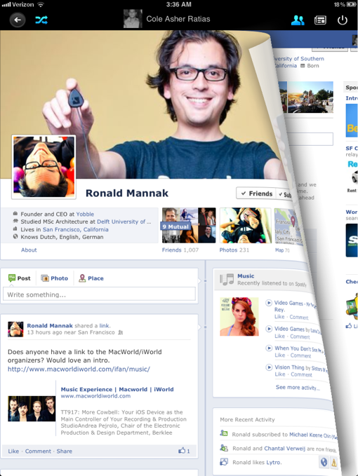 The free app is basically a frame around Facebook’s website (which is the case for many iOS Facebook apps) but with a couple of twists. The biggest is that the app lets you browse through your friends’ timelines alphabetically or in random order, which is a nice way to casually flick through the site and ‘rediscover’ friends. There are also some nice page transitions between profiles, reminiscent of iBooks.