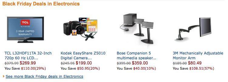 Deals include an $101 discount on the MacBook Air, MacBook Pro and iMac, a $41 discount for low-end iPad 2s, a $61 discount on high-end iPad 2s, and $11 off the iPod Nano. Apple’s Black Friday sale only lasts for the one day, and even with the measly discounts I expect their inventory to go fast. That’s not to say the Apple store should be your first stop of the day, but don’t save it for last, that’s for sure.
