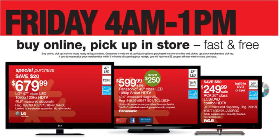 Sears’ Black Friday offerings aren’t quite as amazing as I’d expected, but they’re still rockin’ it in the TV department. You can get yourself a 47-inch LED 1080p HDTV from LG for $679.99, a 42-inch LED 1080p Smart HDTV from Panasonic for $599.99, or a 26-inch LCD HDTV with built-in DVD player for a $50 discount at $249.