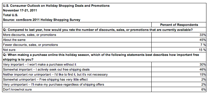 Unsurprisingly, one of the major incentives for online purchases is free shipping. When asked how important free shipping is for making an online purchase this holiday season, 76 percent of consumers said that it was important and 47 percent indicated they would abandon a purchase if they got to checkout and found that free shipping was not included. And 40 percent of retail e-commerce purchases in Q3 2011 included free shipping. This is expected to spike in Q4 of 2011.