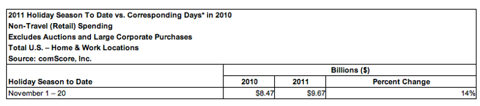 It looks like will be a joyful holiday season for many online retailers this year. comScore is reporting that holiday retail e-commerce spending for the first 20 days of the November to December 2011 season is already up 14 percent from the same period last year. Wednesday, November 16 was the heaviest online spending day of the season to date at $688 million.