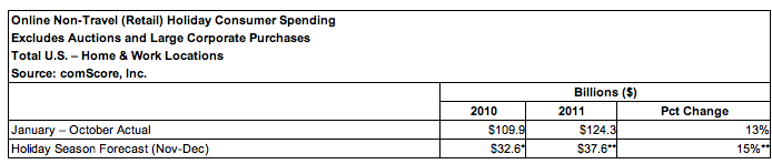 comScore is forecasting that total online retail spending for the holiday season will reach $37.6 billion, 15 percent increase from last year’s season. For background, the 2010 holiday shopping period saw a 12 percent increase from 2009.