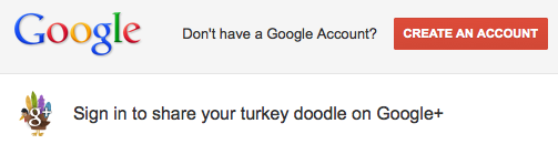 Doodle G+ buttons could, because they leverage convenience. You could copy and paste the link wherever, but hit the G+ button and a pre-populated share prompt appears. Don’t have an account? Google tells why you want one: “Sign in to share your turkey doodle on Google+” Simple, direct, and effective. Unlike on most websites, here G+ buttons don’t have to compete with those from Facebook and Twitter. Before, Google+ was trying to sign people up without a clear value proposition for why they should.