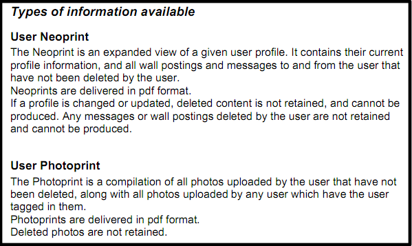 The “Facebook Law Enforcement Guidelines” explain how Facebook has in the past provided data sets with scary names such as “Neoprint” (all profile information and public communication), “Photoprint” (all uploaded and tagged photos), as well as IP logs of up to 90 days and user contact information. The latest versions of the guides from 2010 show that Facebook will release data “Upon receipt of a valid subpoena or a legal document with equivalent”.