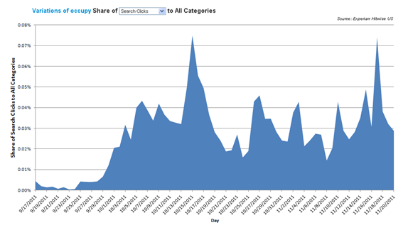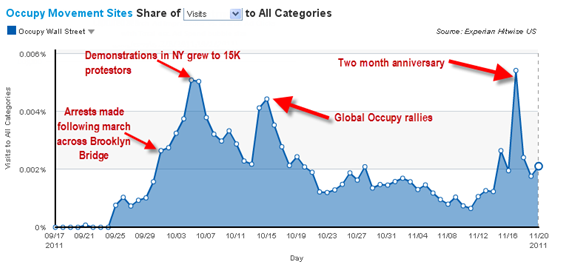 Experian also reminds us that interest in the OWS movement ebbs and flows with newsworthy events, peaking during the movement’s first two weeks, then again during the clearing of Zuccotti Park and then again during the movement’s two month anniversary.