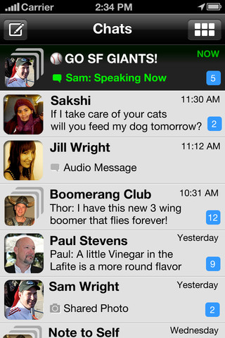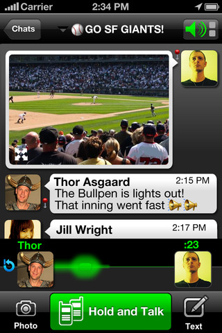 To use Voxer, you simply download it from either store (iTunes here, Android here), create a new identity or log in with Facebook, sync it with your phone’s address book and/or Facebook, then start chatting with other individual friends, or groups that you join or create. The interface shows a text message style interface. You hold a talk button to record a quick message for the other party, although there’s also an option to listen live to an incoming message that a friend is recording. You can also send text messages within the flow of correspondence.