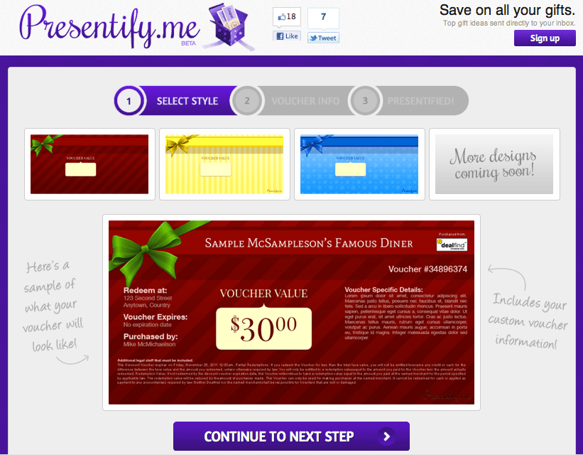 Presentify.me aims to the solve the aesthetics problem by turning vouchers into pretty gift certificates. It currently works with vouchers from Groupon, Dealfind, Tippr or GiltCity, with more on the way. To use the site, you’re walked through a quick wizard where you input the pertinent info (the link to the deal, voucher number and your name) and choose a design. For now, there are only three holiday-themed designs to choose from, but Vander Hoeven says they’re preparing themes for other occasions, like birthdays, Valentine’s Day and Easter. Further down the road, user-generated designs will also be featured.