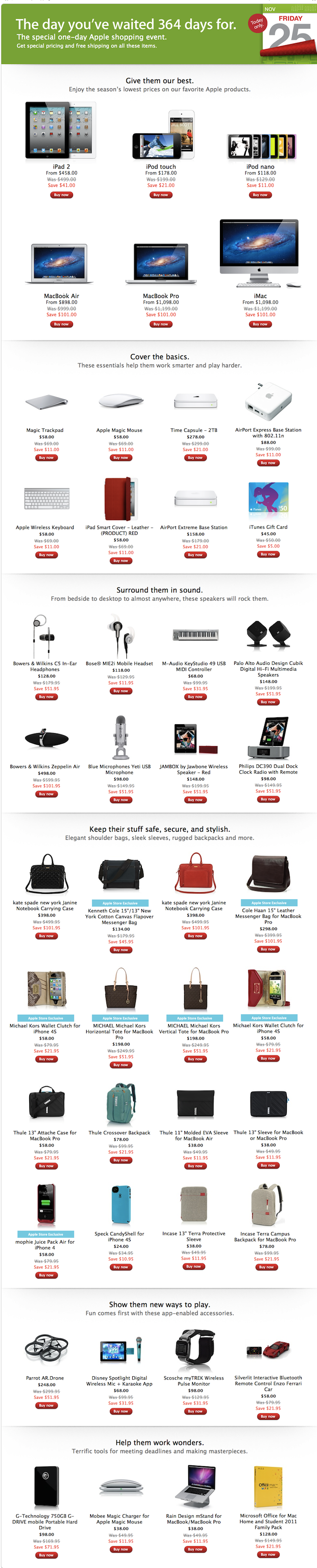 Third-party offerings are also on display on Apple’s site, with some interesting deals: Jawbone’s JAMBOX can be bought for $148 instead of $199.95 (a $51.95 discount) and the lovely Parrot AR.Drone is available for purchase at a price of $248 instead of $299.95 (also a $51.95 cut).