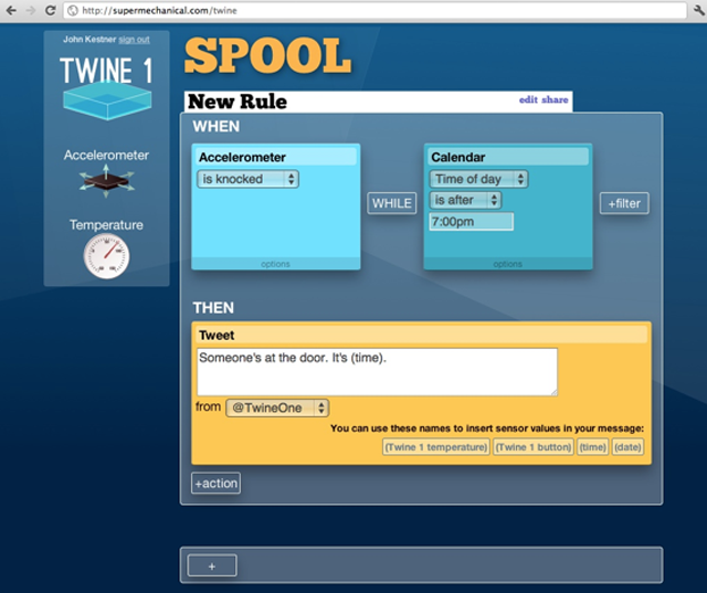 The Twine, which reminds me of a Square from a design simplicity perspective, comes with a web app, ‘Spool’ which allows you to program its sensors with natural language rules like “When: accelerometer is at rest, Then: Tweet” in the case of the laundry done thing, for example.