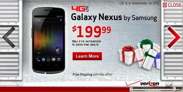 No, this isn’t a turkey-induced hallucination: ads for Verizon’s LTE-capable Galaxy Nexus have begun to pop up on a number of Android fan sites, and they clearly state that Samsung and Google’s latest joint effort will retail for $199.