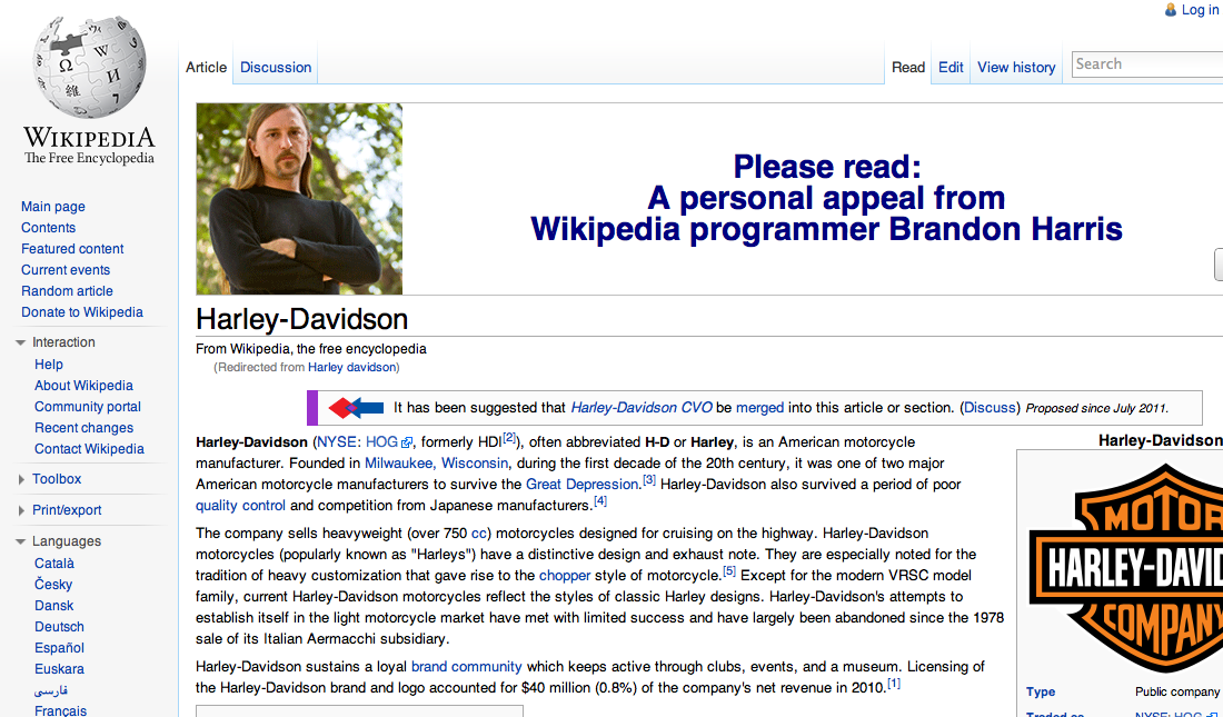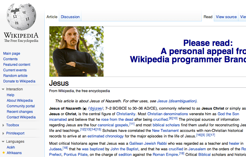 The good news is that Wikipedia has finally switched up that image of Jimmy Wales begging for money on its homepage. The bad news is that they’ve replaced it with another unfortunately left-aligned image of some random guy (Wikipedia programmer Brandon Harris to be precise) who, according to my email inbox, looks like everything from Jesus, to Nickelback lead singer Chad Kroeger to a member of the Hell’s Angels.