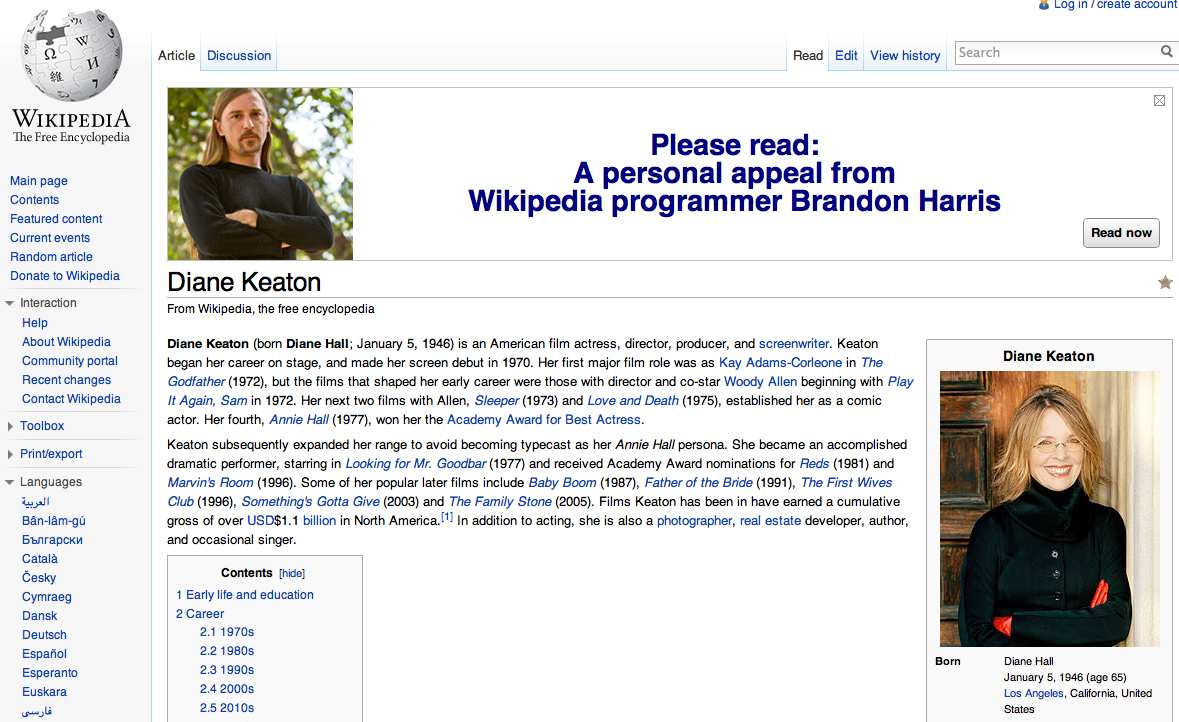 And because Harris’ image is left aligned, the weird article title/image juxtaposition thing still stands; The last straw was when I was Wikipedia-ing actress Diane Keaton last night and up he came, inadvertently wearing the same outfit and in the same pose as the Annie Hall star.