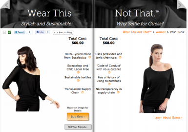 As to how it works? Fashioning Change lets shoppers select name brands, or filter based on certain products, at which point the recommendation engine serves eco-friendly and ethical alternatives, based on price point and style. The site also features a product called “Wear This, Not That”, which juxtaposes a name brand with a “green” brand, so that users can directly compare the look and price of the product, as well as compare the practices used by each company to manufacture the product.