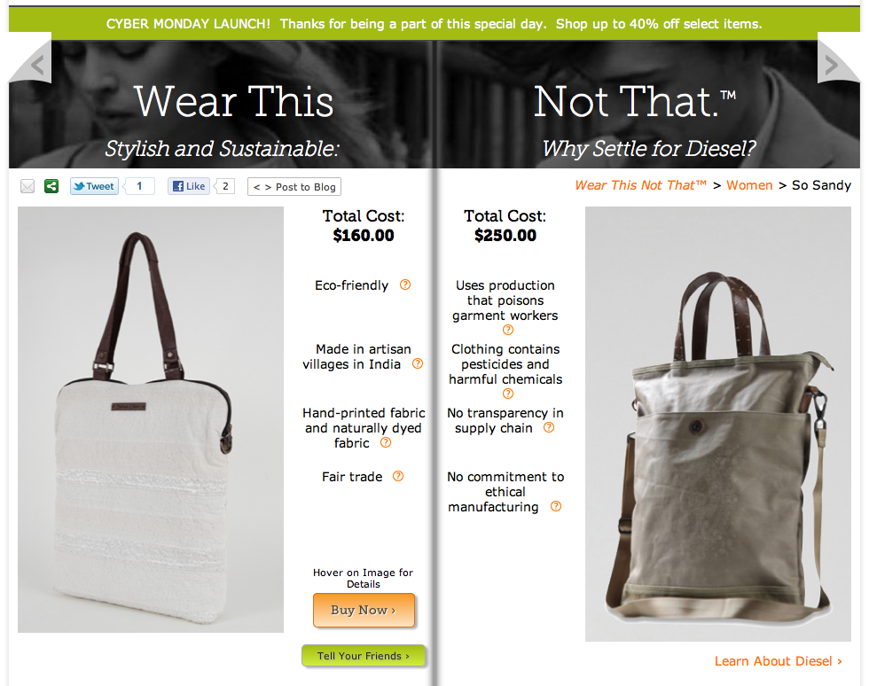 Here’s one for all you do-gooder Cyber Monday shoppers out there. “Doing good” and online shopping have traditionally been at odds. You know what your favorite brands are, where to find them online, and maybe you occasionally find yourself wanting to patronize the green, “ethical” equivalent of your favorite brands. Problem is, you have no idea where to find them, and you probably don’t care that much. Plus, search results don’t give you the price points or styles you want.