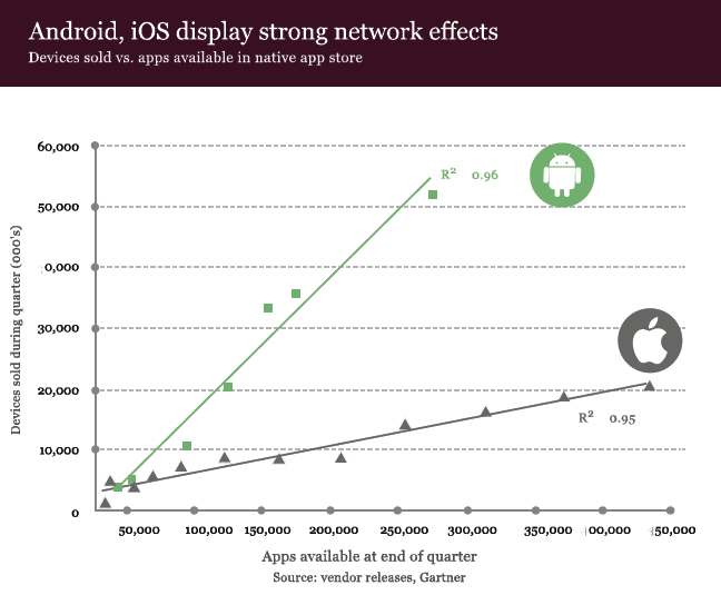 Although the report doesn’t dive into speculation about what happens next, when the rest of the non-smartphone world upgrades their handsets, it does examine the network effects belonging to today’s dominant players. Not only are these platforms winning because of their technological sophistication, but also because of their application ecosystems. With 500,000+ iOS apps and 300,000 on Android, both platforms have reached critical mass. When that occurs, the platform begins to grow exponentially. However, app counts alone aren’t the ultimate measure of long-term health – the sustainability of the developer ecosystem is.