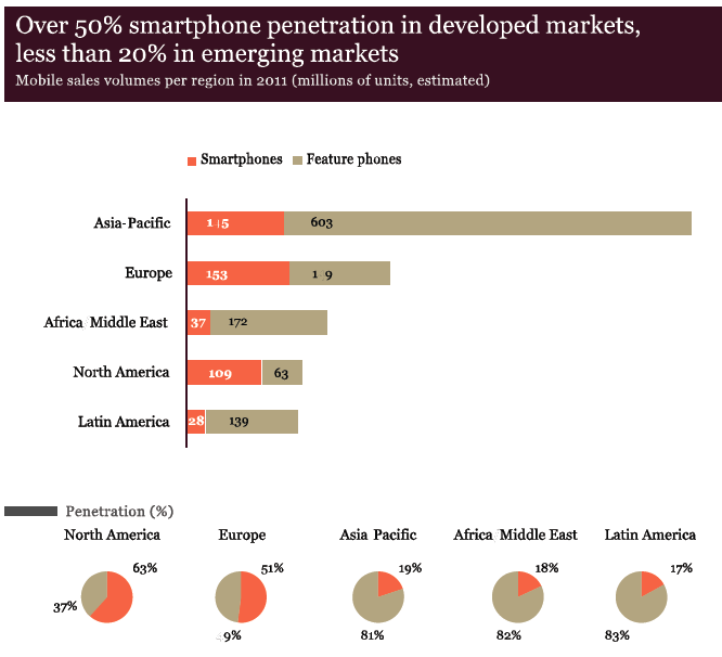 Smartphone adoption varies wildly by region, the report finds. Not surprisingly, those markets where 3G coverage is extensive and subscription plans are “post-paid” (as opposed to pre-paid) see the highest smartphone adoption rates. Meanwhile, in markets dominated by pre-paid subscriptions, the real battle is price. Here, Nokia’s mid-tier Symbian platforms and BlackBerry consumer-targeted models are still holding onto significant market share. However, both platforms are now facing threats from low-cost Android phones, thanks to the latter’s pricing versatility. Android devices today sell for anywhere from $100 to $750 (USD), allowing the phones to compete both on the high-end and the low-end of the pricing spectrum.
