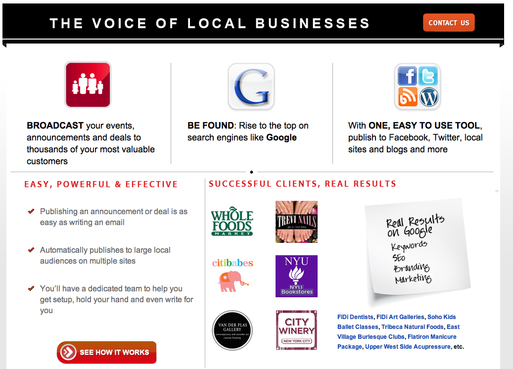 Thus, LocalVox sees itself as a long-term marketing partner for its clients, not a quick fix. So, in contrast with Groupon’s model, which creates episodic bursts of activity and exposure for small businesses, LocalVox provides a searchable history of news content that lives on each business’ web page that is optimized for search engine placement and social media integration — all of which is intended to create additional exposure over time.