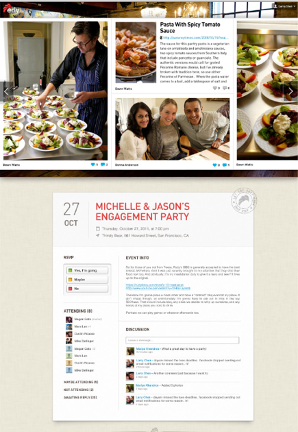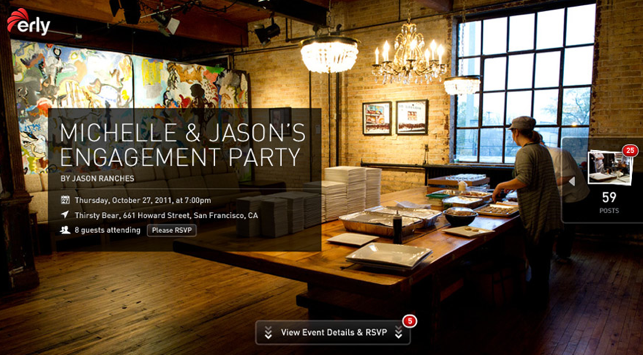 Users can invite people to an event by emailing or posting link to an Event page on Facebook or Twitter or elsewhere. Guests can then click on the link to access details about the Event and RSVP. And Erly can email custom invites to a specific list of guests.