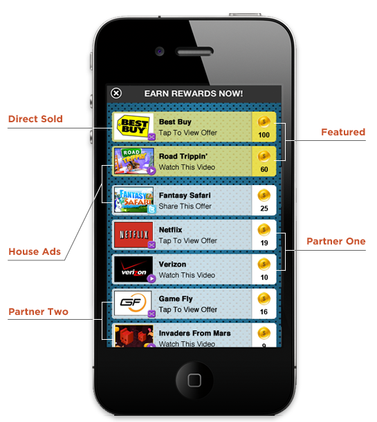 The product has two essential components: The Rewards Wall, which allows app developers to mix and match third-party networks, in-house, and directly-sold offers in one place, along with selecting which providers (and the number of offers) to be displayed. Second is the Rewards Page, which allows them to run reward-driven campaigns through a customizable, branded page that fills the app’s entire screen. Users can access the Rewards page through custom buttons and/or banners throughout the apps.