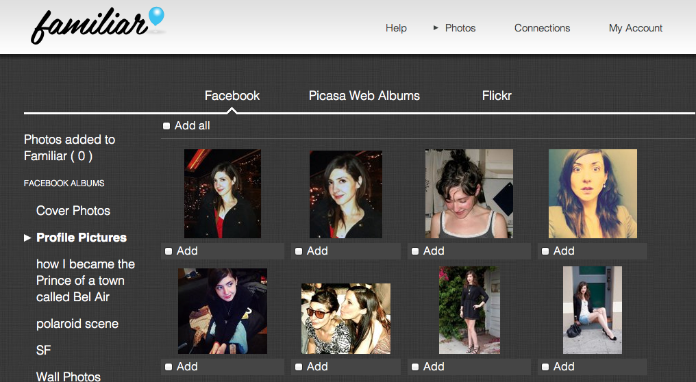 To share photos, you can either drag and drop selected images into Familar’s downloadble desktop app or use the web interface to sync from Facebook Albums (via Facebook Connect), Flickr and Picasa. Familiar co-founder Marcus Womack tells me that they plan on supporting mobile services like Instagram and possibly others.