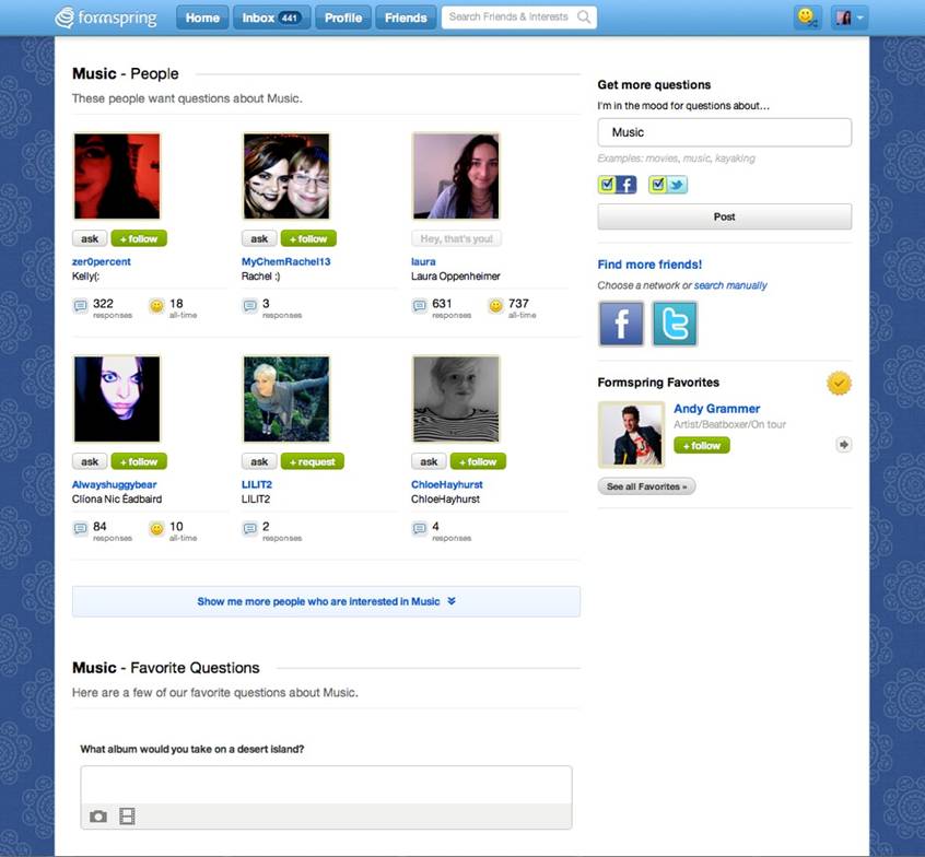In some ways, Formspring feels like the more casual, playful competitor to the expert answers resource that is the continually addictive (and a bit nerdy) startup Quora. But Formspring’s top competition comes not from fellow Q&A sites, but from the “Ask” feature on Tumblr, which allows users to accept questions from others and then post answers publicly on their blog. If anything, Formspring is trying to go more of the Tumblr route these days, than it is trying to take on other Q&A services. That is to say, it’s increasingly focused on social and on “social discovery,” another common trend. Q&A is just the means to make those social connections happen.
