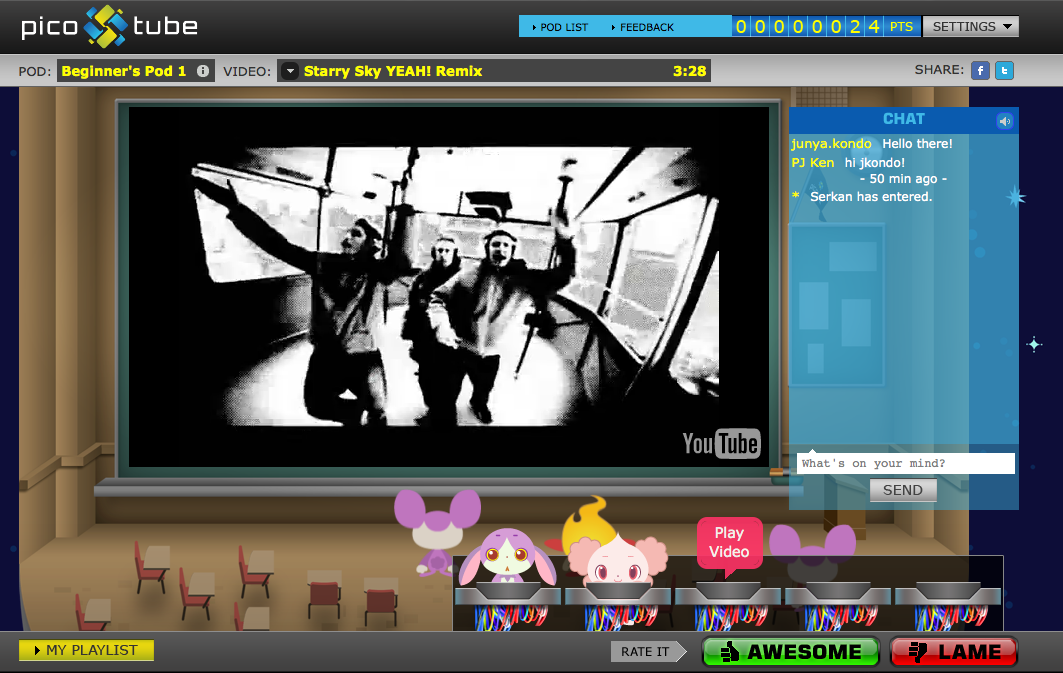 Best of show went to Picotube, which can probably be best described as Turntable.fm for video. The service uses content from YouTube and lets users choose avatars, watch clips together in a virtual theater, create play lists, and rate videos selected by other “video jockeys” (awesome/lame). Picotube is developed by Tokyo-based startup Vettl (which was established in August) and is available in English and Japanese. Vettl plans to monetize the service with virtual item sales in the future.