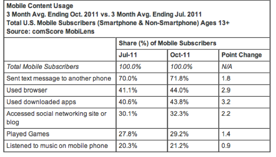 As mobile phone usage increases and smartphone adoption grows, more and more consumers are actually using their mobile for functions other than phone calls. In October, 71.8 percent of U.S. mobile subscribers used text messaging on their mobile device, up 1.8 percentage points. Browsers were used by 44 percent of subscribers (up 2.9 percentage points). Downloaded applications were used by 43.8 percent (up 3.2 percentage points).