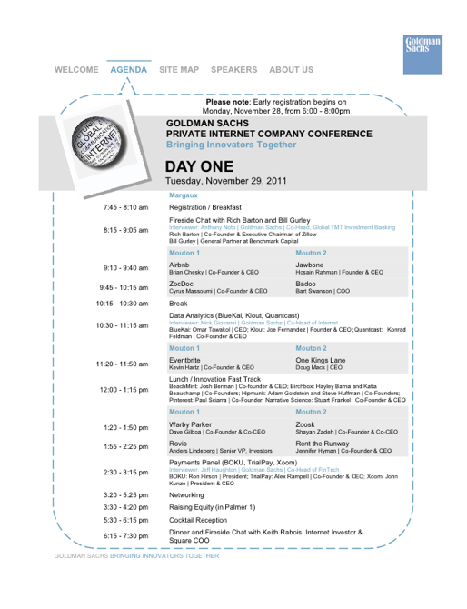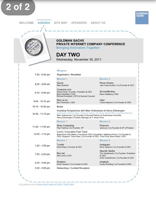 Very very quietly (there is almost no Google footprint), investment bank and securities firm Goldman Sachs held its “Private Internet Company Conference” this week in Las Vegas. During the two-day conference, which lasted from November 29-30th, a gaggle of companies presented their business models to an elite audience composed of bankers, investors and peers.