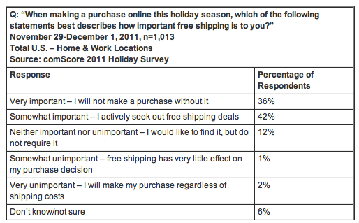 comScore chairman Gian Fulgoni says that most consumers actually expect free shipping deals during holiday promotion periods, and retailers are realizing that including this incentive is necessary to lock-in shoppers. More than three-quarters of consumers say that free shipping is important to them when making an online purchase, and nearly half say they will abandon their shopping cart at checkout if they find free shipping is not being offered, he explains.