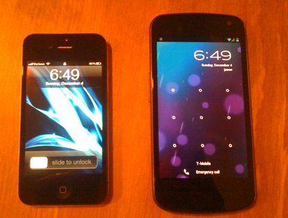 Before me sit two phones. On the left is the iPhone 4S, which I bought (and signed my soul over to Verizon for) in October. On the right sits a loaner GSM version of the Samsung Galaxy Nexus, sporting Android 4.0.