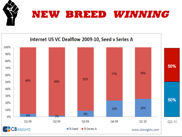 He notes that now half of all of the first institutional money going into startups is now “coming from a new breed of super angels.” This is a dramatic change from just two years ago,when less than 10 percent of the money was coming from super angels (see slide below).