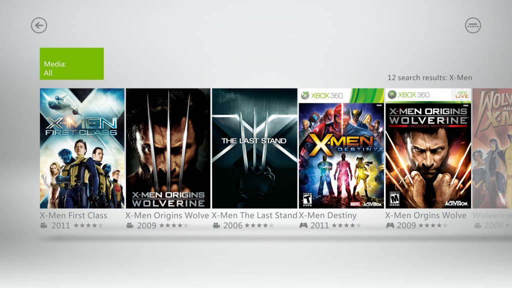 On the surface, the Metro update looks much like Windows 8. Tiles abound, with various UI elements mimicking the new Windows UI almost wholesale. Every new app is Kinect-enabled, allowing you to swipe through tiles with your hands or call up apps with your voice. The most prominent change is the Bing search screen, a service that will bring you web content as well as allow you to search the entire Xbox and Microsoft stores for potential matches. For example, when you search for “X-Men” you don’t get the Wikipedia entry, you get all of the movies, based on availability for download or streaming.