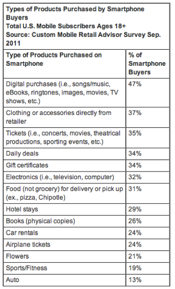 The fact that over 30 percent of purchasers used their smartphone to buy a product while in a store is interesting, considering that many are probably using their phones as a tool for real-time price and product comparisons. This holiday shopping season is expected to be the year of mobile, so we’ll see if consumers use their phones for retail purchases in record amounts.