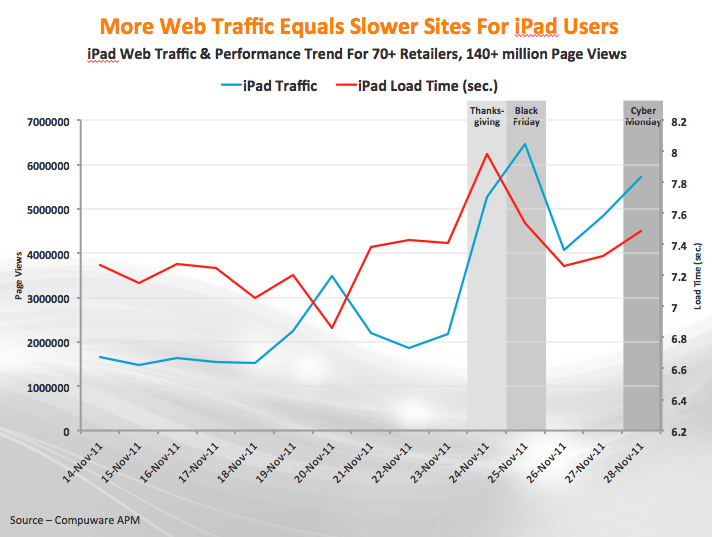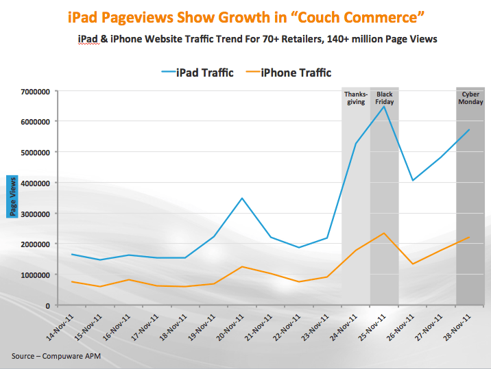 New data from Compuware finds conclusive proof of the popularity of iPads as a shopping device. The firm took a look at the website traffic for 70 U.S. retailers’ delivered to an iPhone or iPad over the start of the holiday shopping season (November 14th through Cyber Monday). On Thanksgiving, Black Friday and Cyber Monday, specifically, there were peaks in traffic with a high of 6,475,354 iPad pageviews on Black Friday alone, based on a statistical sample of more than 140 million pageviews.
