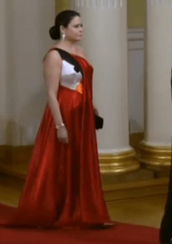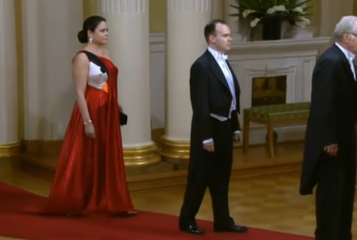 Vesterbacka was invited to an event at the Finnish Presidential Palace, where, alas, the dress code called for something a bit less sweatshirt-y and a bit more tie-and-tailcoat. Fortunately, Peter’s wife Teija found a way to rep the bird: her entire dress.