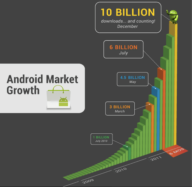 Android Market, the official, Google-sanctioned app marketplace for Android, is announcing a major milestone today: 10 billion total downloads. More important, the rate of growth is surging. Google says that it’s now seeing 1 billion app installs every 30 days.