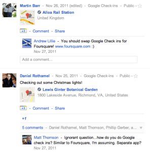 Google’s location-based social service Google Latitude launched checkins in February, prior to the launch of Google+. And when Google+ arrived on mobile, it offered a check-in feature of its own, seemingly based on Latitude, which pulls up a list of nearby Google Places.