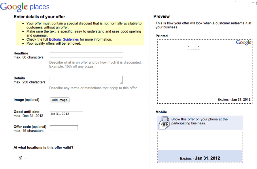 The new help documentation was spotted by Mike Blumental, who also notes that Google has recently started cracking down on businesses whose offers don’t include a real discount of some sort. Business owners are receiving emails explaining that offers should provide “a monetary discount or an additional good or service that is not normally included.” (That’s per the Offers Guidelines here.)