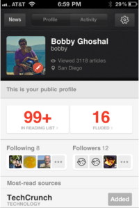 The ability for Fluders to create reading lists, use the Flud equivalent of “liking” headlines and stories which then show up in their activity feeds and can be viewed by those following their profiles, makes Flud into a news equivalent of Facebook or Twitter. Your news profile shows how many stories you’ve read, which stories you’ve “liked”, what content is in your reading list, and what readers and news sources you’re following.