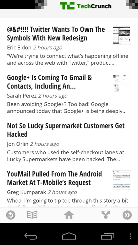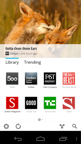 - Reading content housed in the Library section is a pleasant experience. You can flick left and right to progress through a story (or, if you’re reading the last bit of a story, to jump to the next one), and you can hit a Menu icon to see headlines and brief excerpts of recent stories from the same publication. I could definitely see myself using this on a regular basis, particularly on Android devices where Flipboard isn’t yet available. The fact that there are no ads helps.
