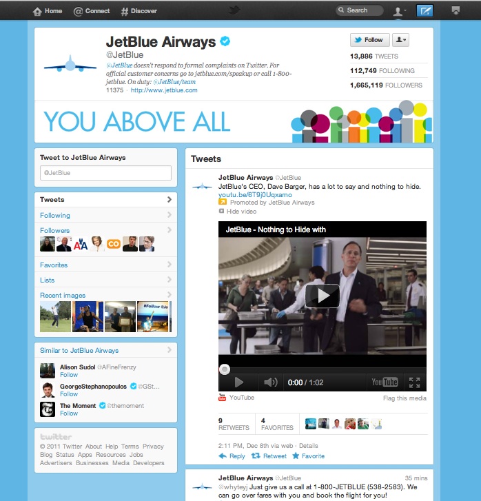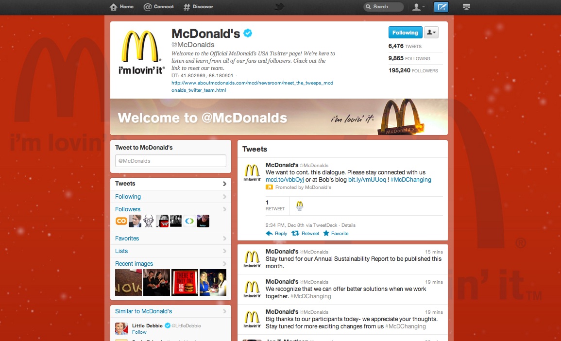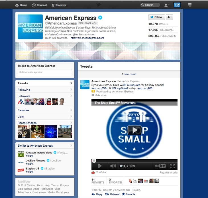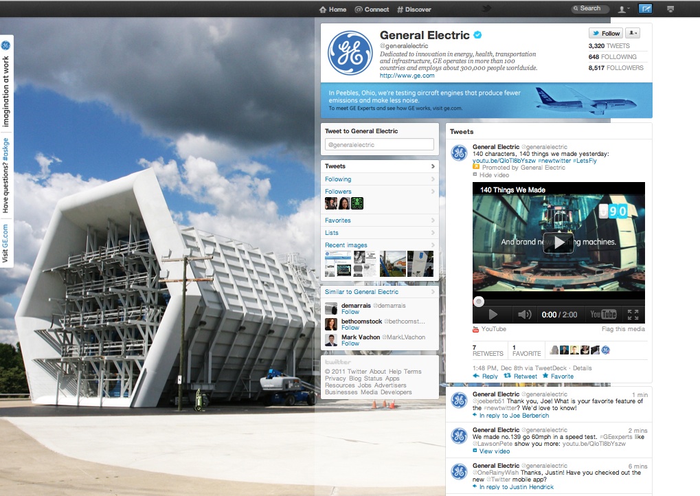 One major change for brands, however, is new brand pages. Not everyone can see what these look like yet, so I’ve pasted some screenshots here from @AmericanExpress, @generalelectric, @JetBlue, and @@McDonalds. The two big changes are a new banner just below the profile information that stretches across the page and the ability to pin a tweet at the top of each brand’s stream. This will give brands a more distinctive presence on Twitter, and should roll out more widely in the first quarter of 2012.