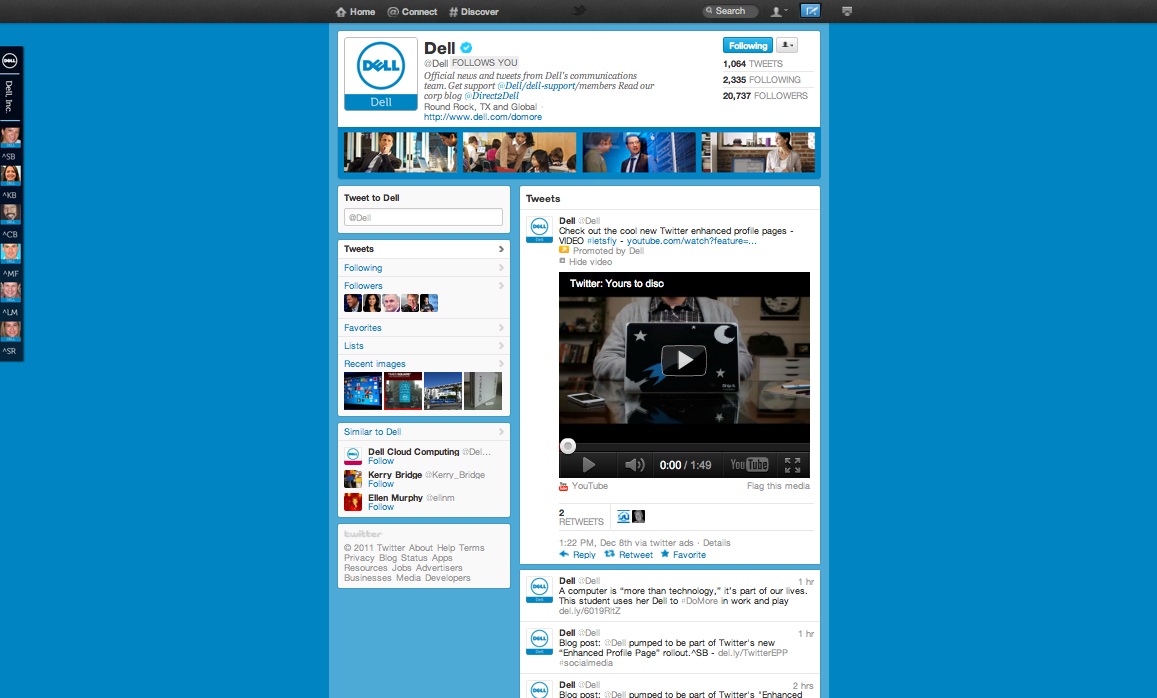 Twitter is launching the new brand pages with 21 partners. If you have the enhanced version of Twitter enabled, you can see them here: @AmericanExpress, @BestBuy, @bing, @chevrolet, @CocaCola, @Dell, @DisneyPixar, @generalelectric, @Heineken, @HP, @intel, @JetBlue, @Kia, @McDonalds, @nikebasketball, @NYSE_Euronext, @GhostProtocol, @pepsi, @Staples, @subwayfreshbuzz, and @VerizonWireless.