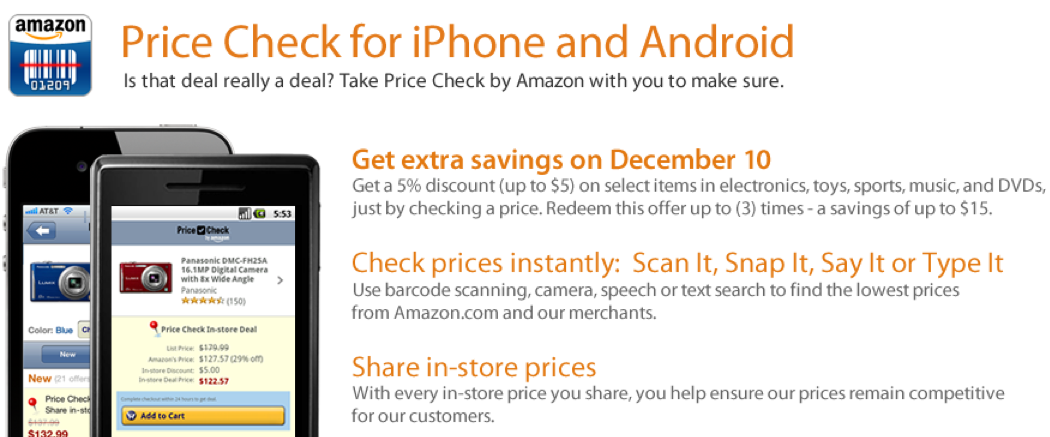 Today, December 10th, Amazon is offering a very special deal you’re going to love and your local brick-and-mortar retailer is going to hate. Use its PriceCheck mobile app and get 5% off your purchase, up to $5 at a time, as many as 3 times. Why the discounts to use PriceCheck? The app is designed to get you to visit local shops, try out a product, submit valuable pricing data to Amazon, leave without buying anything, and make your purchase on Amazon instead.