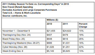 comScore just released its U.S. online holiday spending numbers for the season to-date, and as predicted, consumers continued to spend online in record amounts. For the first 39 days of the November to December 2011 holiday season, $24.6 billion has been spent online, which is a 15 percent increase compared to the same days last year.