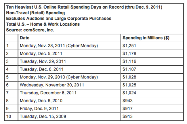 To put this in perspective, seven individual shopping days have surpassed $1 billion in spending, and the majority of these took place this year. Cyber Monday 2011 leads with $1.25 billion in sales, and Monday, December 5, 2011 now ranks as the second heaviest spending day in history at $1.18 billion.